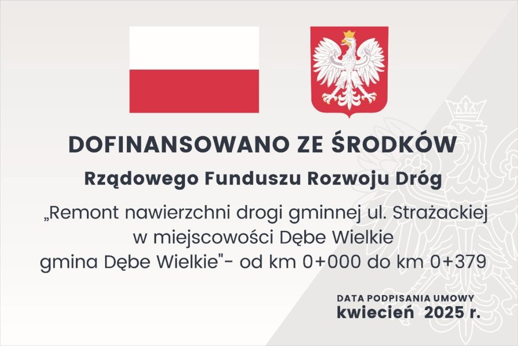 W zakresie przedmiotowego zadania wykonany zostanie remont ulicy Strażackiej w miejscowości Dębe Wielkie gmina Dębe Wielkie. Zakres zadania obejmuje wykonanie od podstaw nowej konstrukcji drogi: podbudowy drogi, nawierzchnię jezdni mineralno-asfaltową o szerokości 5,5 m na odcinku 379 m oraz pobocza z kruszyw łamanych.