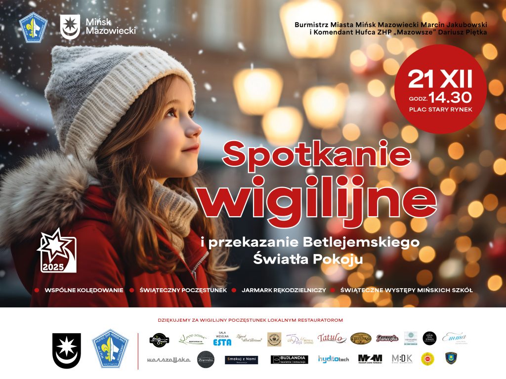 21 grudnia o godz. 14:30 Stary Rynek w Mińsku Mazowieckim ponownie stanie się sercem świątecznych spotkań. Razem z Hufcem ZHP „Mazowsze” zapraszamy mieszkańców na miejską Wigilię połączoną z uroczystym przekazaniem Betlejemskiego Światła Pokoju.